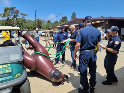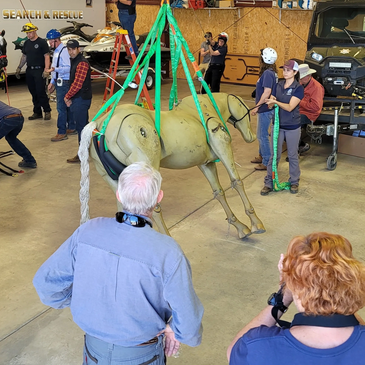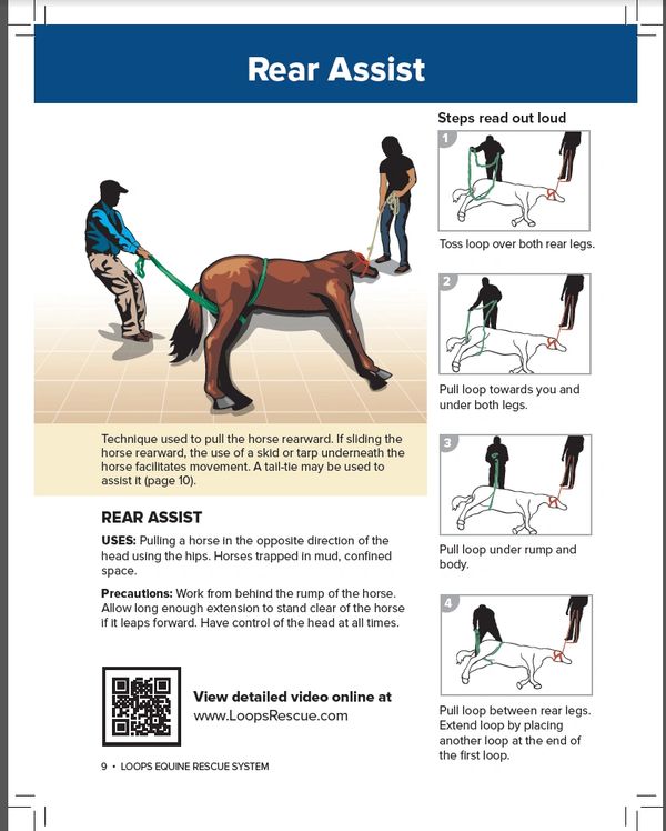 The Loops Rescue Sling can help in many emergencies. The system is effective in commonly used basic technical rescue procedures, including lifting a down horse. The sling has been tested in live horses, and results have been published in peer-reviewed research studies. It is designed for short-term field use situations and does not replace prior full-body lifting systems. The advantages to this system are that it lifts by the skeletal system, there are no knots, no J hooks, and no metal bars, and it fits in a small duffel bag that can be carried to the horse needing help. Each kit has step-by-step instructions for forward and rear assistance, rolling a down horse, mud rescue, horizontal drag, and lift. It has been sold throughout the United States to animal services, veterinary clinics, mobile veterinary practices, universities, fire departments, search and rescue, and equine emergency evacuation teams.- International sales to Canada, Japan, Mexico, Ecuador, UK, Saudia Arabia and other countries.